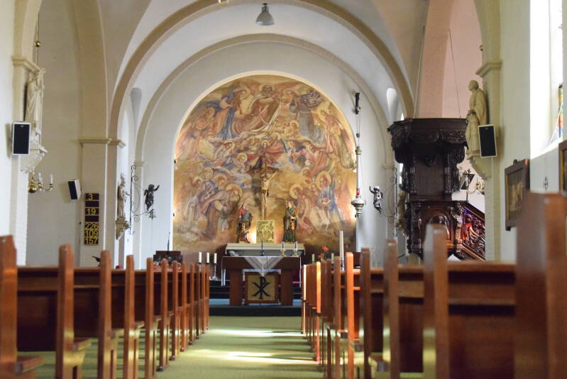 Kerkinventaris: in het torenportaal beelden, tezamen de Drievuldigheid met Maria en Johannes Evangelist voorstellende, afkomstig van het gesloopte 18e eeuwse altaarretabel. 18e eeuwse preekstoel en biechtstoel; vroeg 16e eeuws Catharinabeeld; laat 18e eeuwse beelden van Hubertus, Jacobus en Barbara. Gesneden orgelbalustrade uit 1857. In 1970 werd het interieur aangepast aan de vernieuwde liturgische eisen van het Tweede Vaticaans Concilie (1962 - 1965), dat tot doel had de Katholieke Kerk aan de moderne tijd aan te passen.